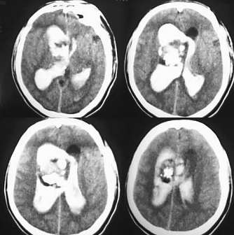 侧脑室扩大,脑室内大量出血,脑室内肿块阴影并钙化,脉络膜乳头状瘤继发出血可能。