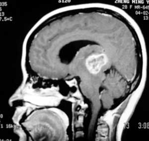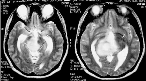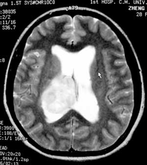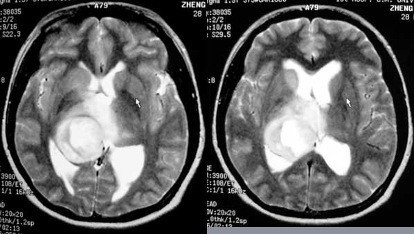 考虑:①丘脑胶质瘤可能大。②脑积水。