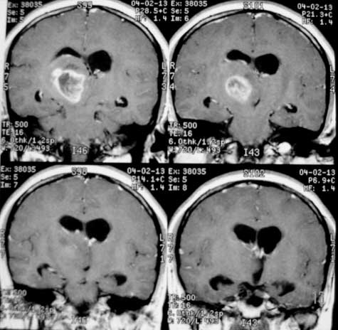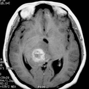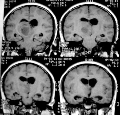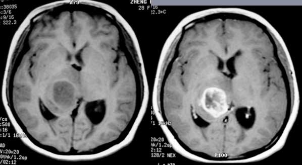 t1等信号内出现点状高信号,考虑为出血灶,肿块内侧可见弧形低信号,为脑积液影。长t2,其内有混杂信号,周壁强化明显,内不规则强化,生长位置似在右侧丘脑,又似在来源于侧脑室,故脉络丛乳头状瘤不排外。