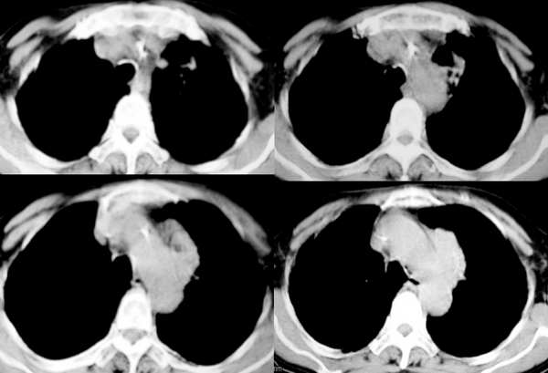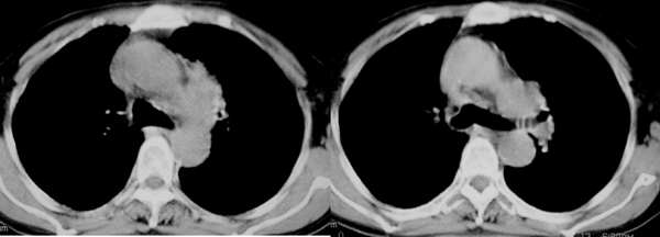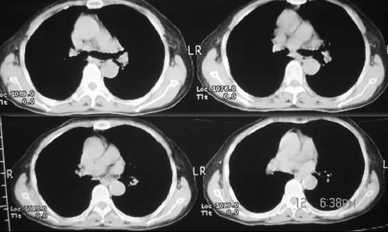 以下是引用wxy7406在2006-3-12 22:55:00的发言:[br]郁闷!病灶和主动脉弓是宽基底相连,但主动脉弓壁是清晰可见;肺窗示病灶边缘见不规则毛刺样改变;肝左叶见巨大囊性病灶。我考虑胸部病灶是纵隔型肺癌,肝内病灶不好说是啥。