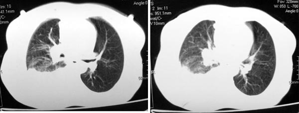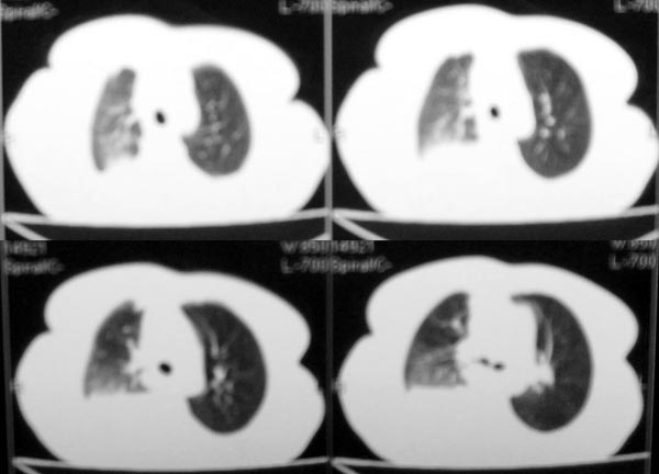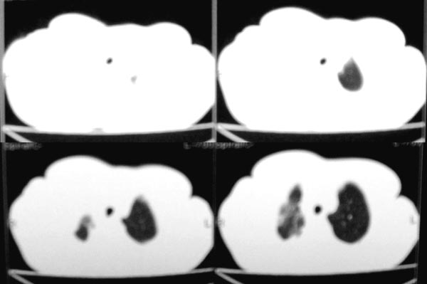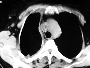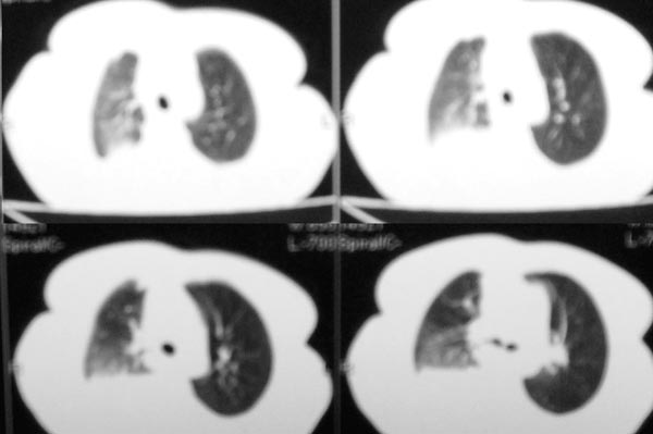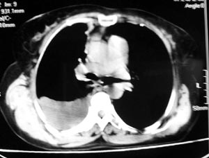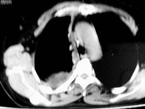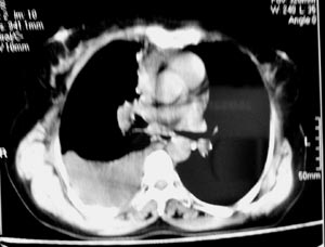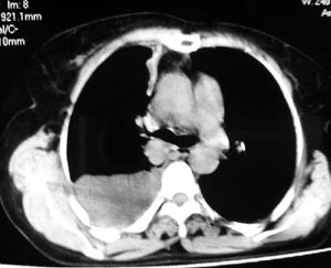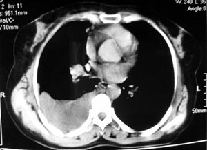 以下是引用gaozhengyi在2006-4-12 7:18:00的发言:[br]图像不是太好,但可以见到下列恶性征象:[br]1 单侧肺门增大[br]2 纵隔侧胸膜明显增厚[br]3 肋胸膜结节影[br]结合纵隔略宽、单侧胸水首先考虑肺癌。