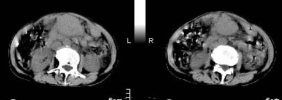 实话实说,不认识,看什么都象!!我怎么感觉左侧肠管分布及形态那么不舒服呀?病史也有些短,会不会是腹膜后脓肿呀!不好意思,猜的,向大家学习来了!呵呵