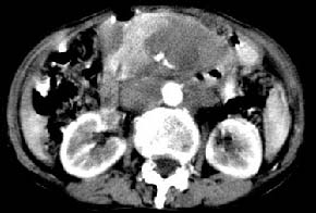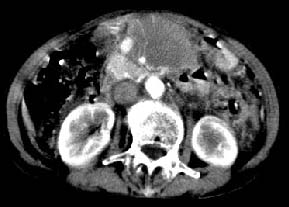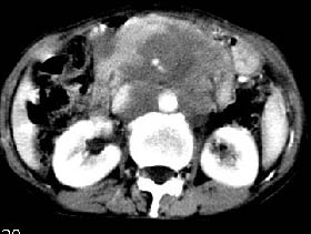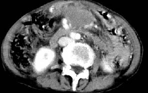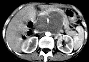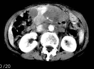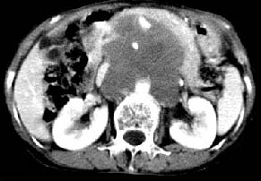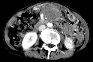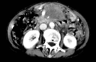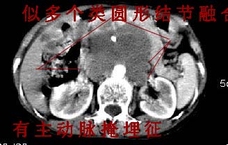 再看从肠系膜根部到胰腺后主动脉及上腔静脉周围可见相连的较大的软组织肿块影,形态不规则,呈明显