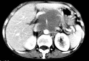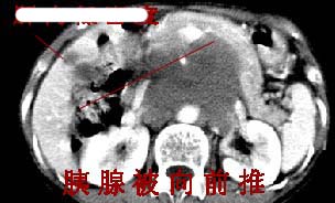 胰腺受压前移,胰管扩张,应为腹膜后占位,病灶密度不均,有低密度坏死区,强化扫描强化不明显腹腔干动脉受侵,考虑腹膜后恶性占位