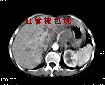 增强所见,腹腔动脉,肠系膜上动静脉被肿块包绕,结合平扫的条状低密度区恰好位于血管周围,较大的