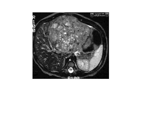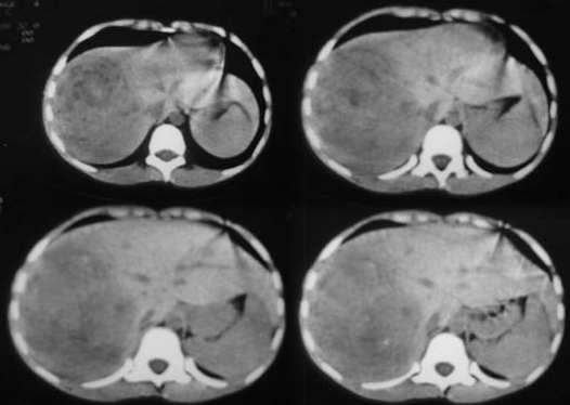 肝右叶巨大类圆形混杂密度影,边缘清晰,病变内部密度不均匀,可见环形钙化,我们考虑肝脏恶性肿瘤,肝母细胞瘤或肝细胞癌.请大家就平扫给予分析和指教.谢谢!!患者直接上省级医院检查,未做增强!