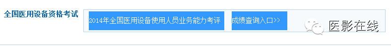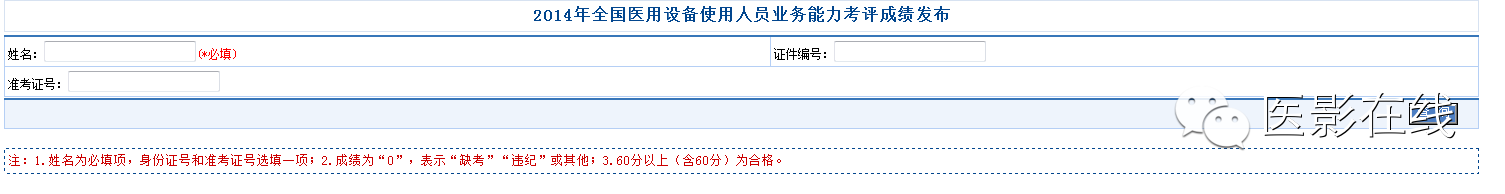 千呼万唤始出来,中国卫生人才网今日已开放2014年全国医用设备使用人员业务能力考评成绩查询入口,请大家第一时间登陆查询60分以上(含60分)为合格(详见如下链接或者点击本文左下方阅读原文)。 http://www.21wecan.com/rcpj/cjcx/index.html http://118.186.64.203/bdrs/query ... ryPage&uid=1263 “医影在线”祝大家取得好成绩!