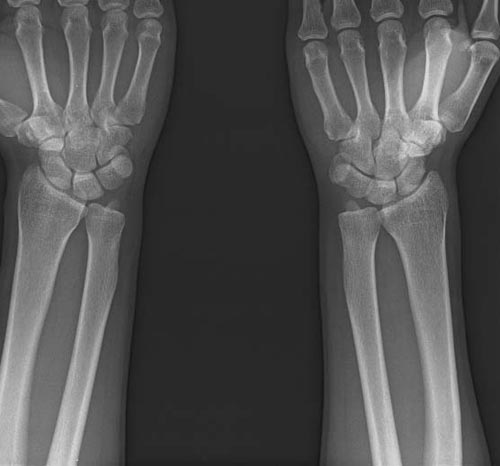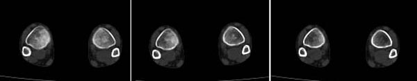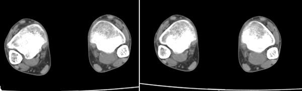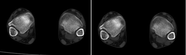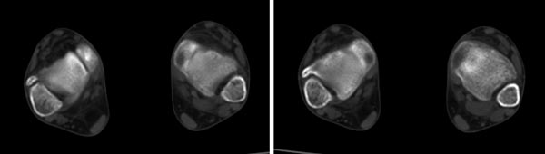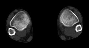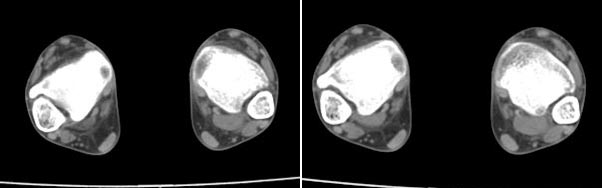 x线检查月前片示双踝关节骨质未见明显异常。一月后肿胀大部消失,疼痛稍有好转,摄片示两侧骨下段条带状高密度影,边界尚清。ct扫描示两侧胫骨下段骨皮质增厚不明显,髓腔内密度显示磨玻璃样增高,髓腔显示狭窄。