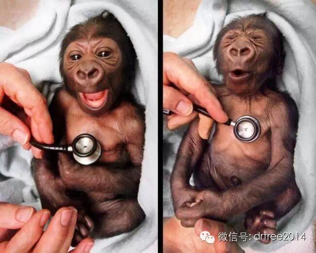 (所有的老师在上“听诊”这一节课的时候,都会告诉学生:一定要把听头捂热了在给病人听诊。不然,病人就像这个小猩猩...)