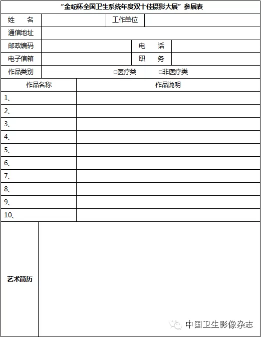关注“中国卫生影像”微信,发表您的作品,并附上“作品表”上所列相关信息。