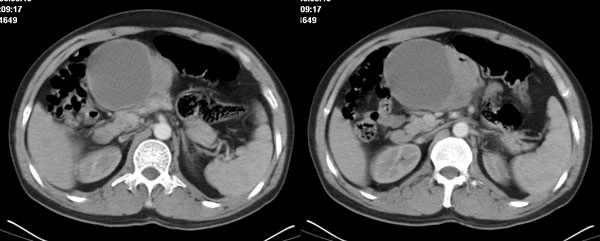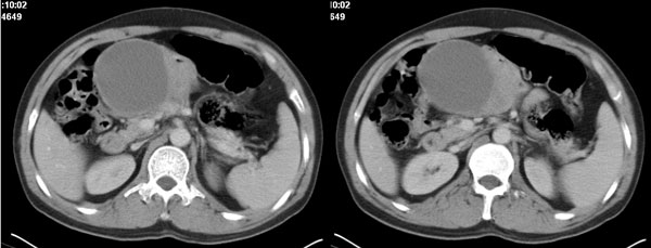 2 如果是单纯囊性病灶,则需鉴别于胆总管囊肿、胰腺囊肿、系膜囊肿了;胆总管囊肿应稍偏后,但憩室型胆总管囊肿可呈类似表现,肝内则用多发肝内囊肿来解释也勉强通过--先天性胆管囊肿不能排除;胰腺囊肿需可出现如此部位,但较少,胰腺本身及胰周均无异常,可能性较小;系膜囊肿则不能解释肝内病灶,如果用二种疾病来分开解释则违背了一元论原则。