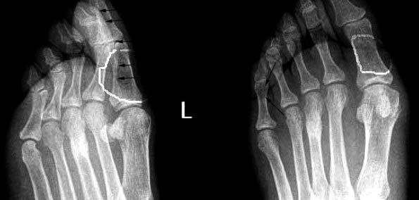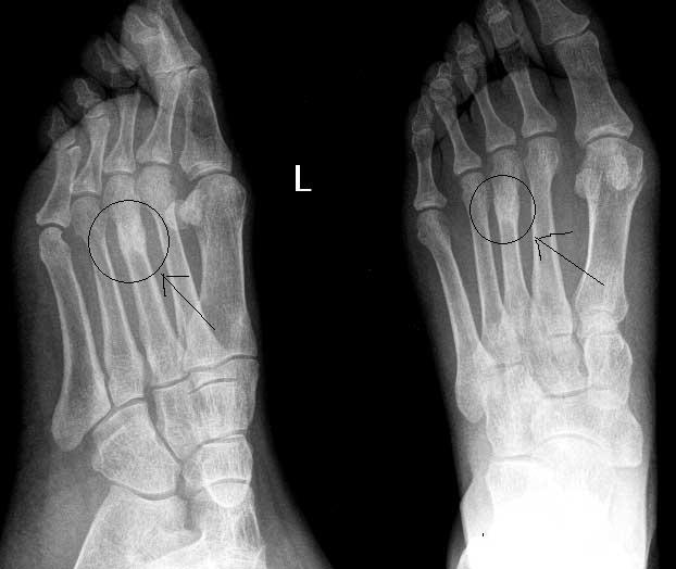 以下是引用www123456在2004-7-20 23:17:45的发言:[br]典型的第三跖骨 疲劳骨折。[br]对于第一趾骨的病变怀疑是没有根据的,斜位所见影像是由于第一趾的跖趾关节软组织和骨皮质凑成的。在正位片可见第一趾的骨质是完好的。