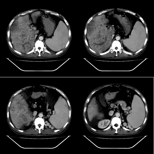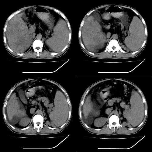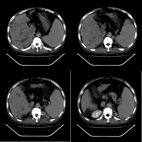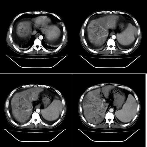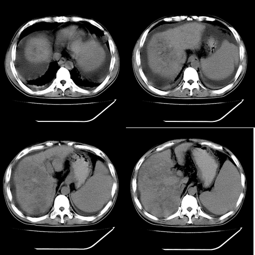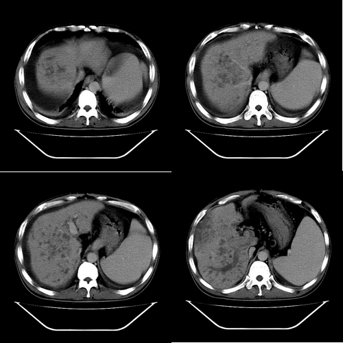 以下是引用yz在2006-6-2 12:20:00的发言:[br]肝左右叶比例失调,左叶体积明显缩小,肝边缘凹凸不平呈波浪状外观,肝左右叶可见不规则之斑片状低密度影,边界不清,以右叶为甚,肝门区增宽,增强后于动脉期病灶不均匀强化,门脉及延迟期均呈低密度,门脉主干及其右支无强化,以门脉右支明显,其内可见低密度影充填,门脉主干周围可见强化的细小侧支循环血管影。脾大,脾门血管明显增粗,脾后左侧膈脚前可见串珠状增粗强化血管影,并见胸腹水征。[br]1、考虑为弥漫性肝癌并肝门静脉主干及其右支癌栓形成,门脉海绵化。[br]2、肝硬化,脾大并门脉高压。[br]3、双侧少量胸水、腹水。