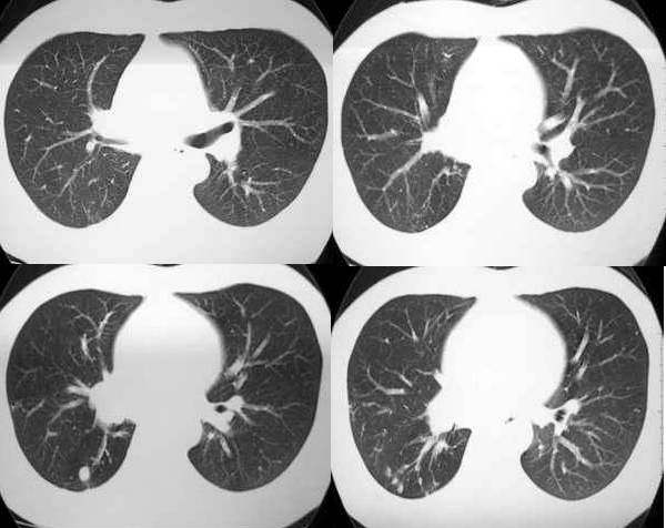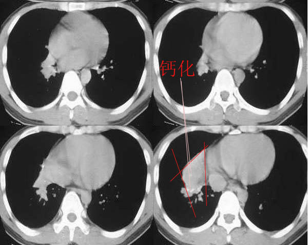 右下叶背段及下叶内后基底段见斑点状及小片状影,有钙化。右下所谓的软组织密度影不在肺门,而是在下肺静脉层面以下,与膈相近,可能是横膈部分图像,图像没传完,易误导大家。综合考虑感染性病变(结核可能性大)