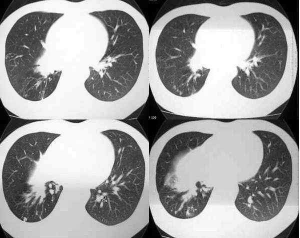 右肺门区软组织肿块,边缘钙化,右肺中叶不张,右下叶背段结节状及斑片状影。首先考虑结核,建议支气管镜检查排除其他。