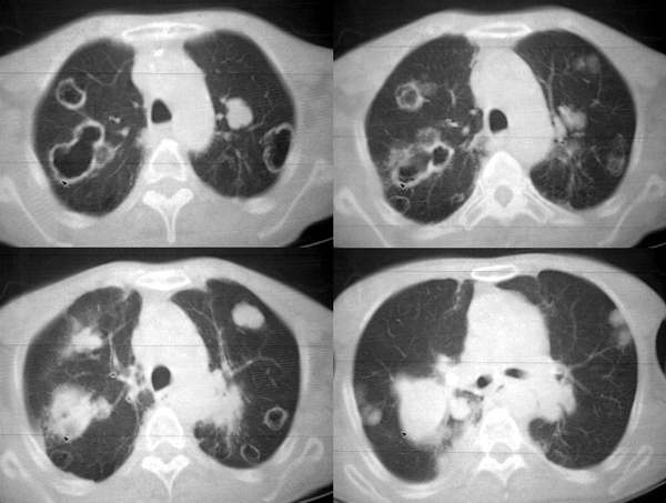 右肺门软组织块影,右主支气管及中间段支气管管壁明显增厚,两肺内多发结节及大小不等的类圆形薄壁空洞,纵隔内多发肿大的淋巴结;