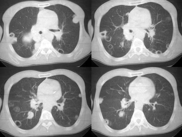 肺癌双肺转移。以前见过像这样治疗后空洞增多的。