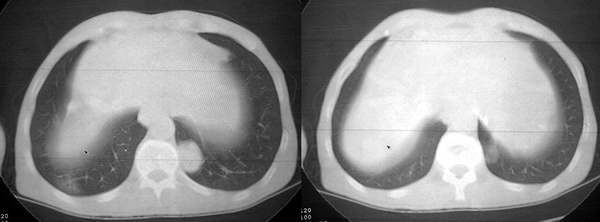 单个cpm灶的空洞形态具有多样性,壁可薄可厚,厚度可均匀可不均匀,瘤灶大小变化也大。但总的说来,cpm 的洞壁较薄,4mm以下者最多(53%),其次为4—15mm者(34%),而15mm以上者却较少。另外洞壁厚度均匀者也较多(47%)。笔者认为这些与壁薄而均匀的囊样及小环形空洞较多有关。一般认为壁薄而均匀者多为良性空洞,而癌性空洞的壁多较厚或厚薄不均。woodring等-8 j认为洞壁厚度4mm以下者92%为良性,15mm 以上者95%为恶性,15mm者良恶性各半。蒋瑾等-9 j发现83% 的原发空洞型肺癌的壁厚度超过15mm。以上说明cpm的空洞形态不同于肺良性空洞及原发癌性空洞,具有其独特性。本组40%(16/40)的病例中同时存在多种空洞,说明cpm病例具有空洞类型的混合性。同样的洞腔变化既可见于病情好转时,也可见于病情恶化时,特别是同一种病例可同时出现两种相反的洞腔变化,说明洞腔变化具有非恒定性。