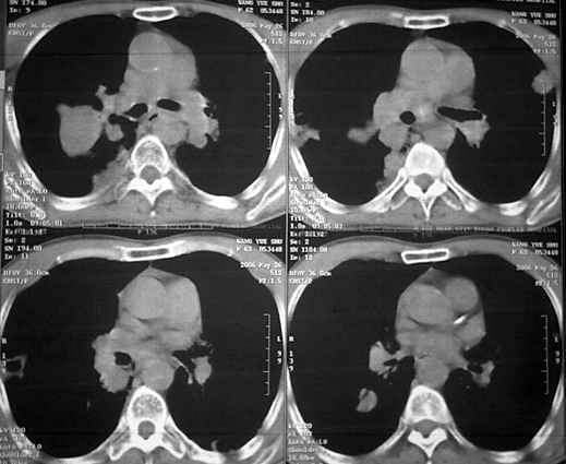 考虑:1.右中央型肺癌伴两肺广泛性转移及纵隔转移。