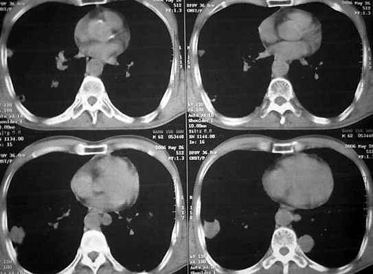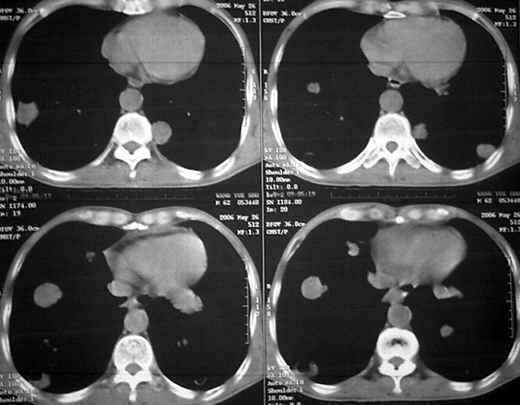 双肺内及胸壁旁见有多发软组织实性阴影和空洞,实性病变多见有脐凹切迹,贴近胸膜的见有胸膜凹陷征;空洞的壁多为厚薄不均,形态不规则,纵隔内见有较多肿大淋巴结,诊断为双肺内转移性病变。