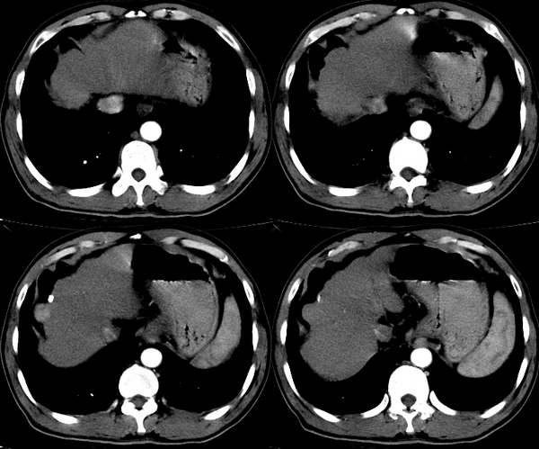 患者 男性 53岁,丙肝病史10年,右上腹隐痛2年,近15天加重,彩超发现肝内实质性肿物,行ct结果肝硬化癌变比较典型,故上传,共同学习。