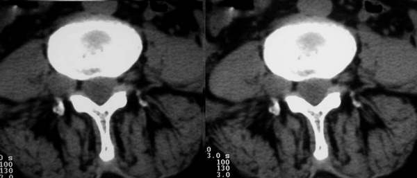 右侧椎间孔外侧见类圆形软组织肿块边缘清与右神经根关系密切。片子上标明了左和右了吗?正常的ct图像病变应该是在右侧呀!为和这么多人考虑或支持左侧!!!! 考虑右侧神经鞘瘤