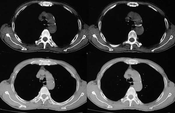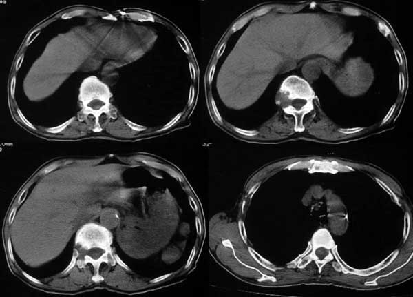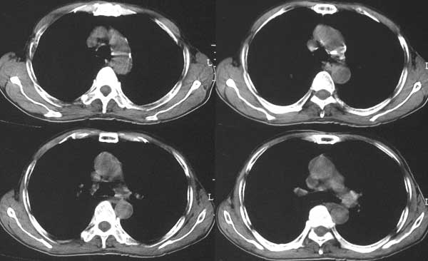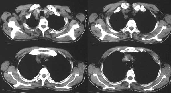 本例病人肺内多发结节灶、双侧肋骨破坏、胸椎椎体及椎弓破坏应是肾癌转移。请大家分析气管内结节灶性质?另外还得麻烦领导给删掉那多余的那幅图。谢谢了!