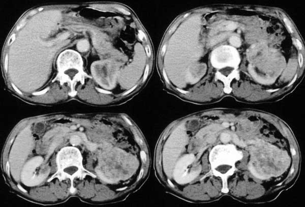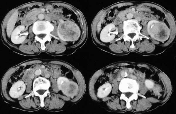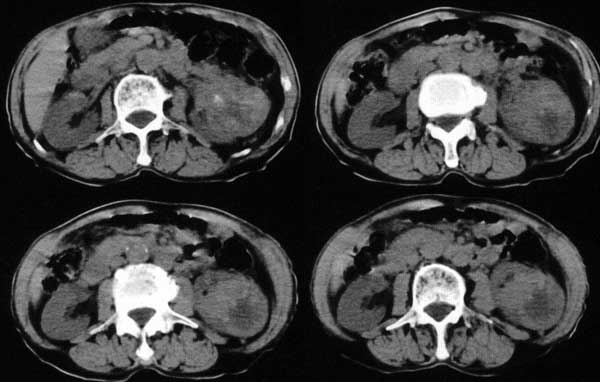 左侧肾癌伴腹膜后淋巴结、胸椎、双肺内转移。