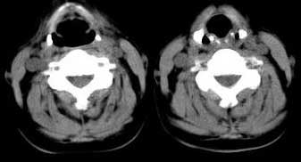 以下是引用jiangjing在2006-6-22 21:06:00的发言:[br]甲状腺左侧叶下部结节状低密影,边界较清晰,考虑甲状腺肿瘤[腺瘤可能性大,恶性待排]