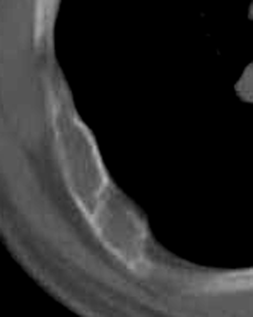 肋骨溶骨性破坏,皮质膨胀呈囊状,可见间隔,部分边缘硬化。考虑肋骨骨纤维结构不良。不除外浆细胞瘤。
