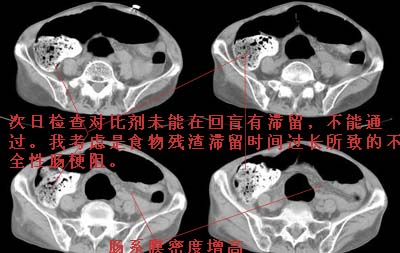 以下是引用winter在2006-7-5 19:56:00的发言:[br]我的病例人气真的很低,不过不要紧,我来公布手术的结果吧,看了结果请大家继续做总结性发言。这个病人做完第二个ct后就手术了,术中发现乙状结肠过长,阑尾短粗并且已穿孔,过长的乙状结肠包裹了穿孔的阑尾致使乙状结肠以上的降、横、升结肠扩张,壁如薄纸(回盲瓣是单向的,乙状结肠又粘连了,所以气体只能积在此区域,直肠呈闭塞状态)。回头看这个图像,阑尾是很清楚的充填了造影剂,可是阑尾周围真的是很毛糙。我只说这么多请大家继续做总结性发言!