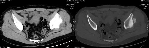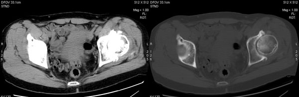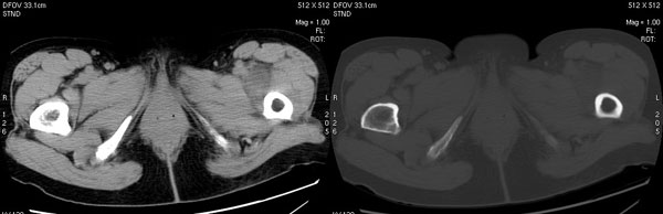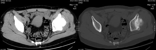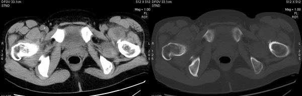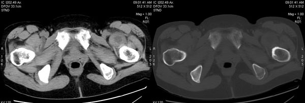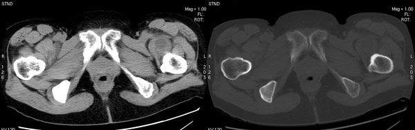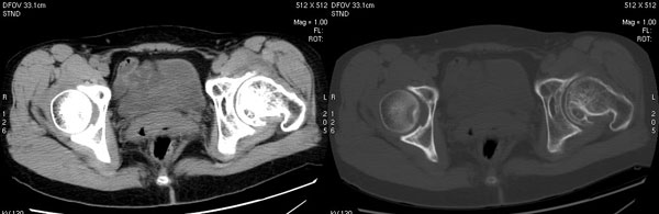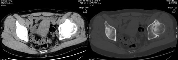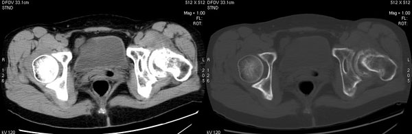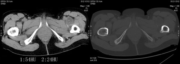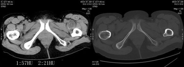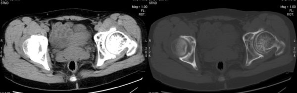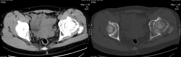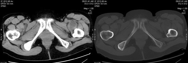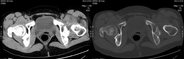 以下是引用jiajie在2006-7-14 17:19:00的发言:[br]ct所见:双侧髋关节不对称,左侧关节间隙变窄,关节面毛糙。左侧股骨头变形、无明显变小,前上缘与髋臼融合,融合处骨质明显增生硬化,并见数个小囊变影。股骨头下端与股骨颈交界部见囊样变,邻近肌肉内见囊样密度减低区,ct值24hu。右侧髋关节形态未见异常。[br][br]ct诊断:左侧髋关节结核可能,请结合临床资料进一步分析。