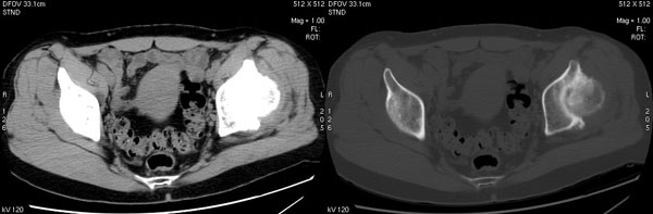 以下是引用lihuuuu在2006-12-5 10:14:00的发言:[br]定位像示:左侧髋臼变浅,倾斜度加大,髋臼外上缘呈波浪状不规则,骨质增生硬化,髋关节上缘间隙明显变窄,股骨头向外上轻度移位。轴位像示:左侧股骨头变形,前上缘与髋臼融合,融合处骨质明显增生硬化,并见数个小囊变影。股骨头下端与股骨颈交界部见囊样变,邻近肌肉内见密度减低区,ct值24hu,内缘见弧形高密度钙化影。右侧髋关节形态未见异常。[br]ct诊断:左侧髋臼发育不良[br] 左侧股骨头缺血性坏死[br] 左侧肌肉内低密度影伴有高密度钙化-考虑早期骨化性肌炎[br] [br]“我认为在描述上已经写了肌肉部分,印象诊断里应该写主见”[br]