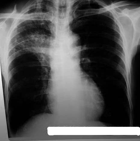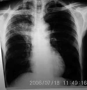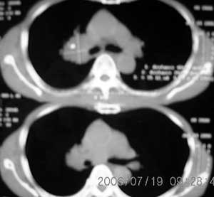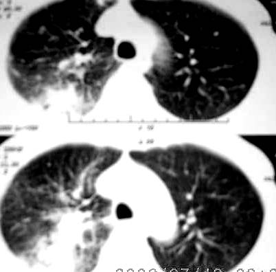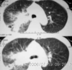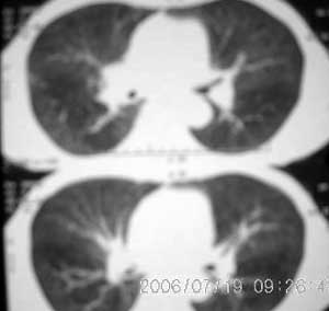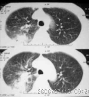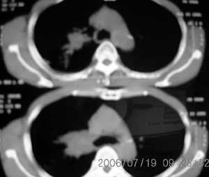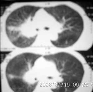 以下是引用卜一在2006-7-20 14:13:00的发言:[br]图象质量差了些,首先考虑:中心性肺癌伴阻塞性肺炎.因发生在右肺上叶尖后段,而且外带见二个空洞影,次考虑:不排除肺结核