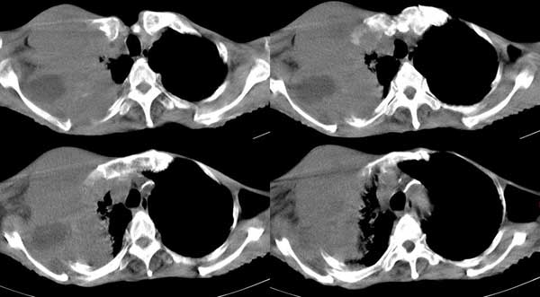 以下是引用乡医在2006-7-20 20:36:00的发言:[br]右侧胸廓塌陷。右前上外侧胸壁软组织肿块,其内见有低密度影,肋骨呈溶骨性表现。右肺上叶见大量的间质纤维化表现。右侧膈肌上抬。[br]患者男,81岁,咳喘10余年,继往结核病史,发现胸部体表肿物[br]考虑:1、继发性结核,右结核性胸膜炎伴胸壁结核性感染[br] 2、右侧胸壁恶性肿瘤。
