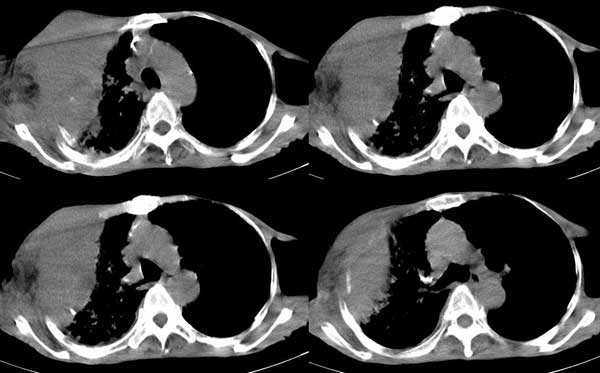 考虑:1 右侧胸壁恶性肿瘤(多考虑:胸膜间皮瘤)。