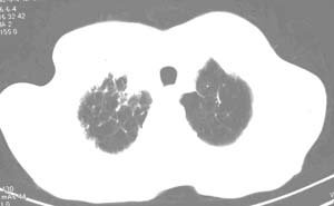 鉴别,细支气管肺泡癌,弥漫性可有病变侵犯一个肺叶,呈炎性实变,密度偏高,可见支气管气相、蜂窝状气腔,与本例影像上不易鉴别,但临床多为咳嗽、咳白色泡沫痰,感染症状轻。