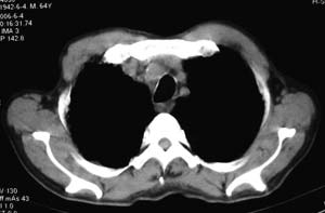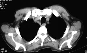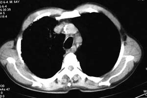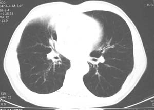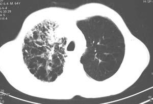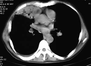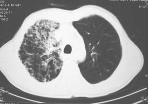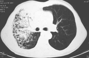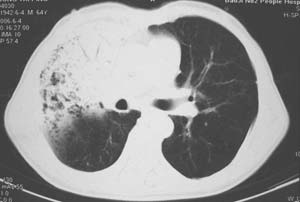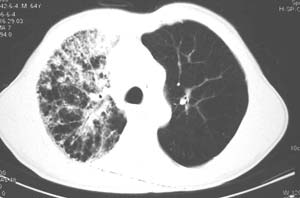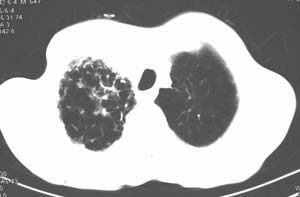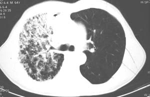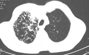 影像学表现:右肺上叶大片状、网格状及索条致密影,前半部密实向后逐渐疏松,其内参杂斑点状小结节,密度不均匀,内见含气支气管像,纵隔内见肿大淋巴结.