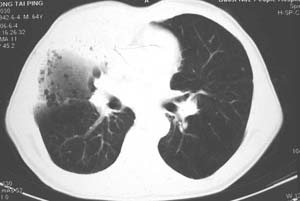 右肺上叶大片片状、网格状及索条致密影,前半部密实向后逐渐疏松,其内参杂斑点状小结节,密度不均匀,内见含气支气管像,纵隔内见肿大淋巴结,其他肺呈弥漫性小叶中心性性肺气肿改变,结合男 64 咳血,咳痰,发热3天,血象1.2万。考虑: