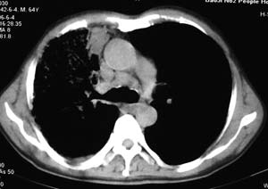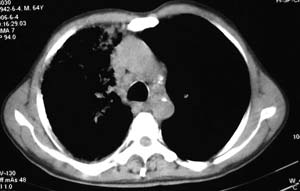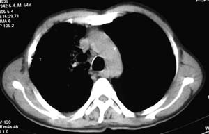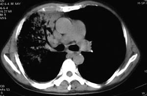 男 64 咳血,咳痰 发热 3天 血象1.2万;右肺上叶满布片絮状致密灶,其内见含气支气管影,右主支气管狭窄,纵隔内见肿大淋巴结。考虑右肺中央型肺癌伴阻塞性肺炎,建议支气管镜检查。