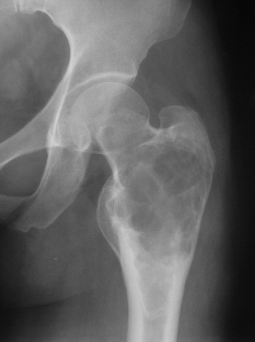 股骨上段膨大,其内见囊性病灶及骨嵴,下部骨质密度增高,首先考虑骨纤,与动脉瘤样骨囊肿鉴别