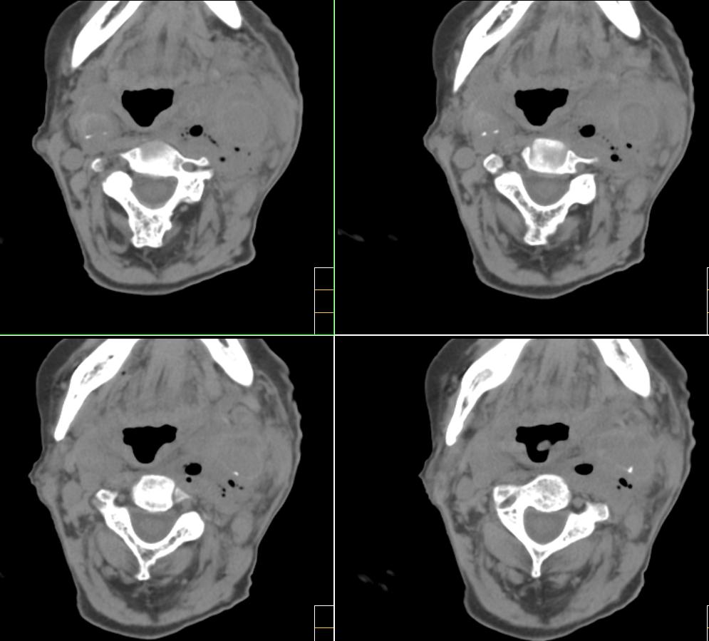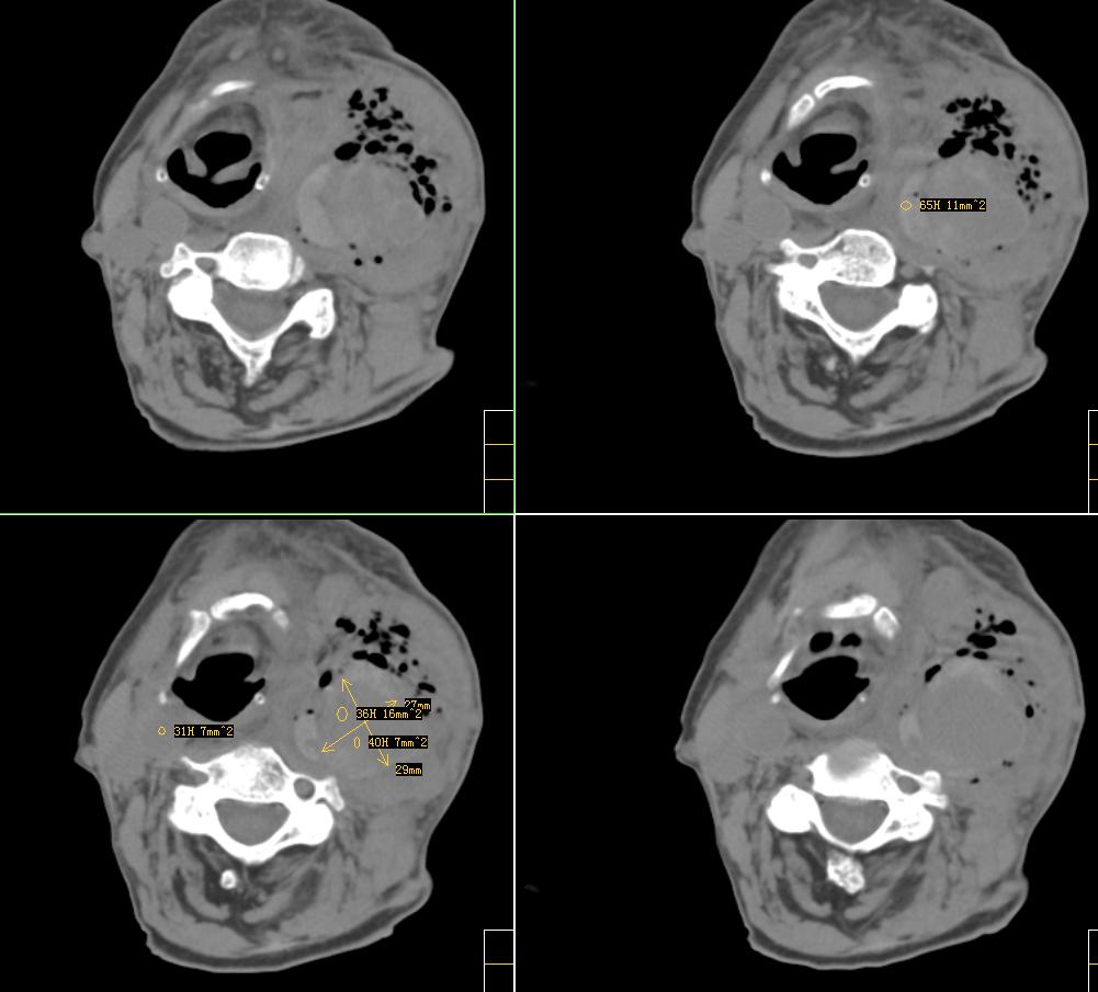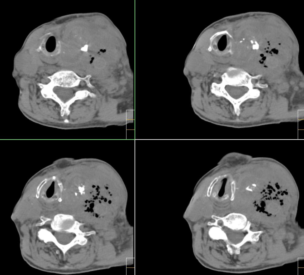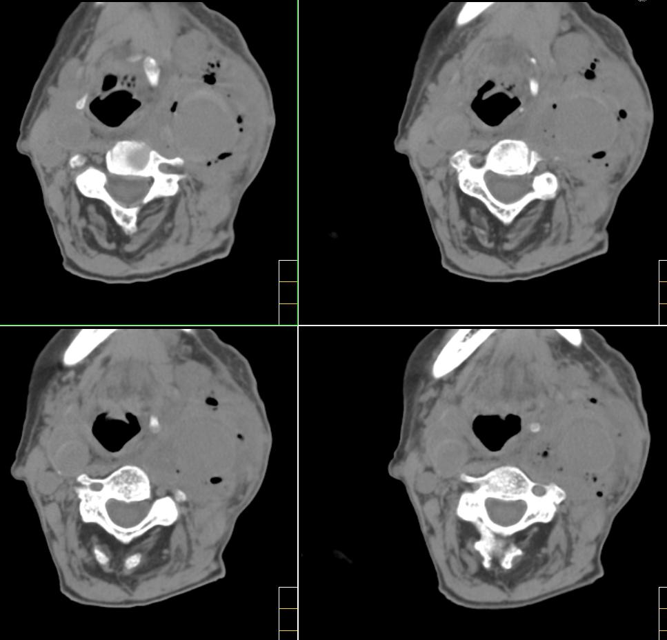 很遗憾,因患者高龄,高血压,肺心病、心衰,身体虚弱,未能进一步做增强扫描,临床上穿刺为动脉血,考虑颈动脉血管破裂(我觉得气体影不好解释),家属放弃治疗出院。[emb10]