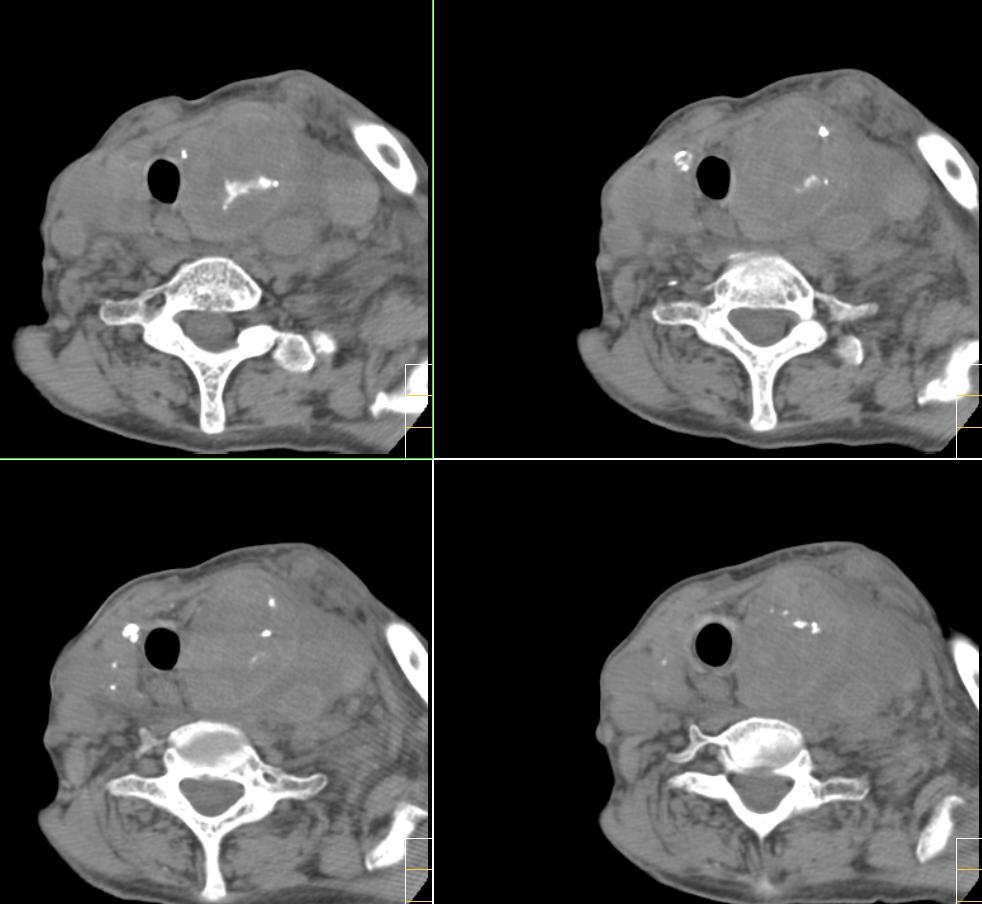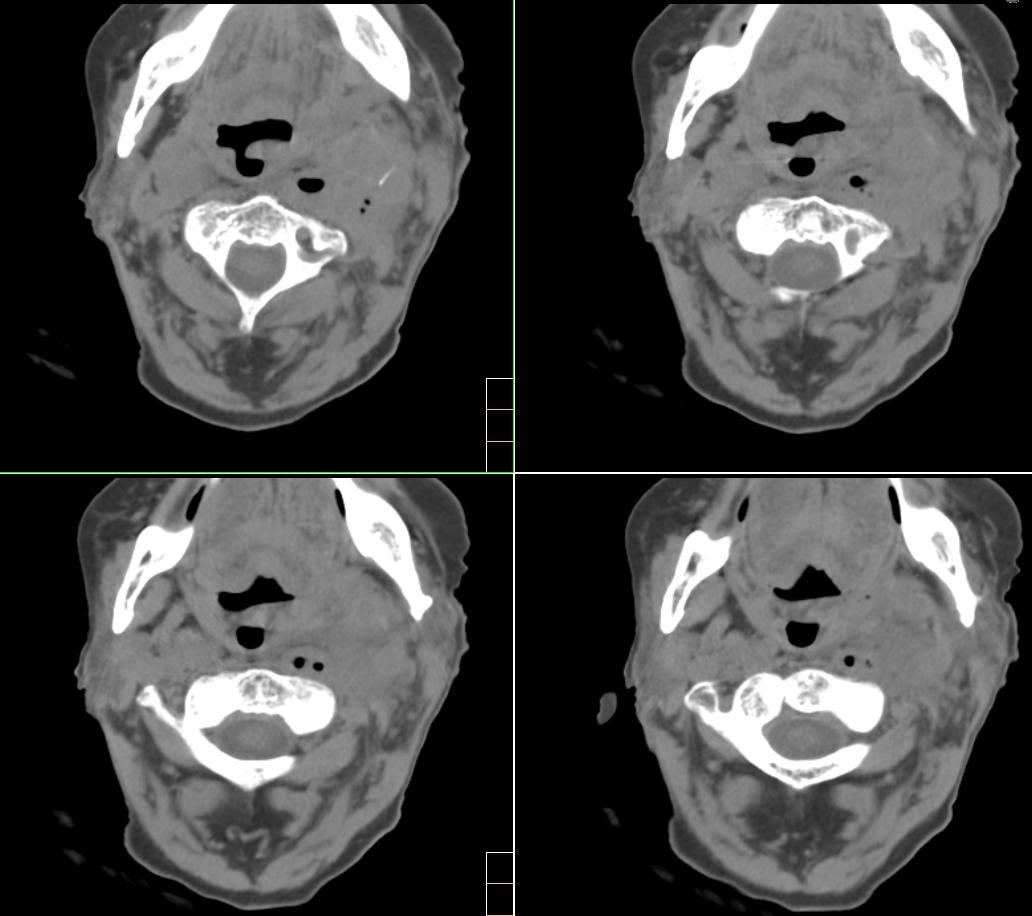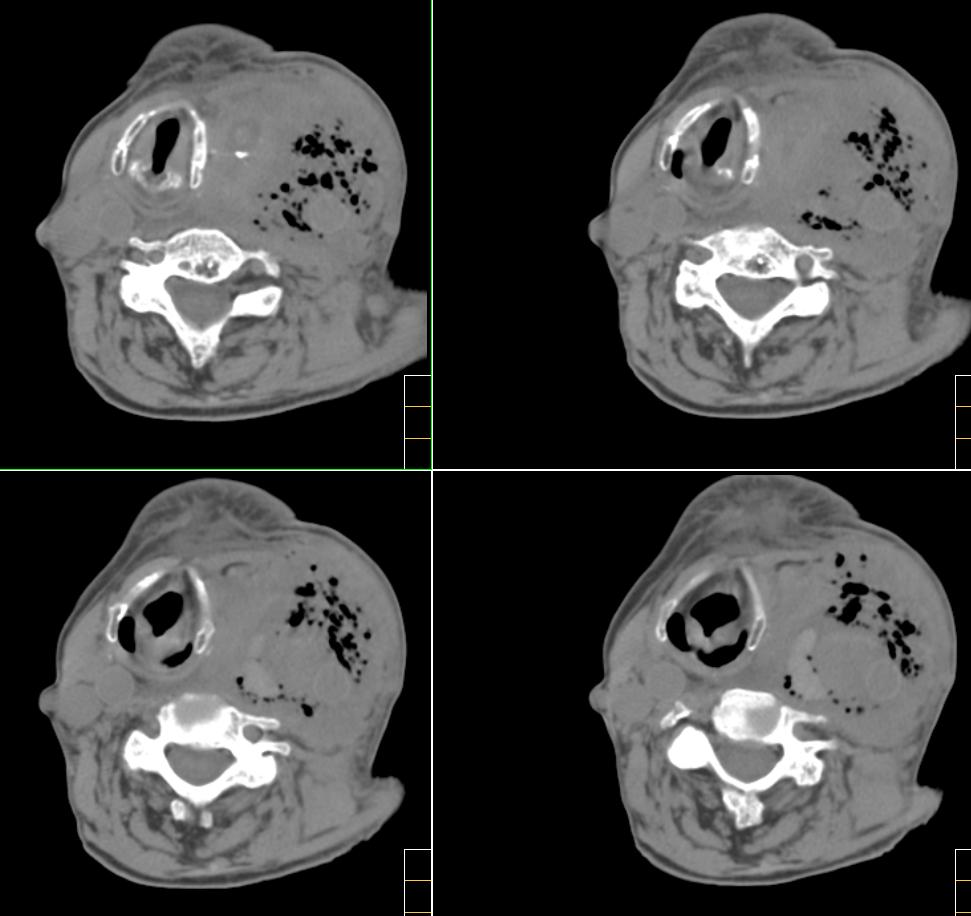 很遗憾,因患者高龄,高血压,肺心病、心衰,身体虚弱,未能进一步做增强扫描,临床上穿刺为动脉血,考虑颈动脉血管破裂(我觉得气体影不好解释),家属放弃治疗出院。[emb10]
