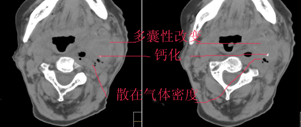 除上诉考虑外,那么多而且不规则、不定形的钙化还应该想到有颈部畸胎瘤的可能性。顺着思路继续,颈部畸胎瘤继发产气菌感染,并在颈总动脉局部形成小脓肿且浸蚀到血管壁。