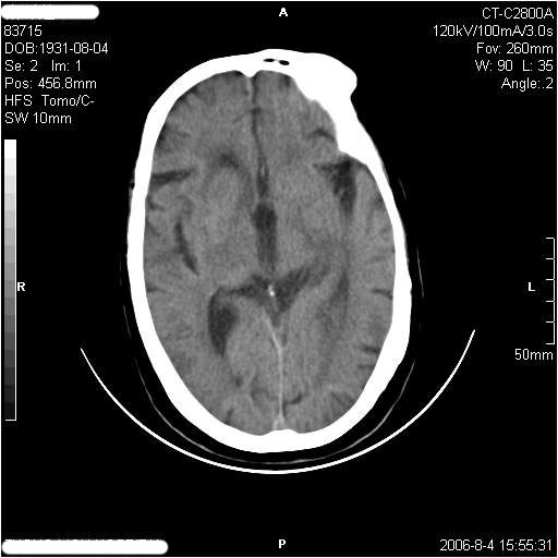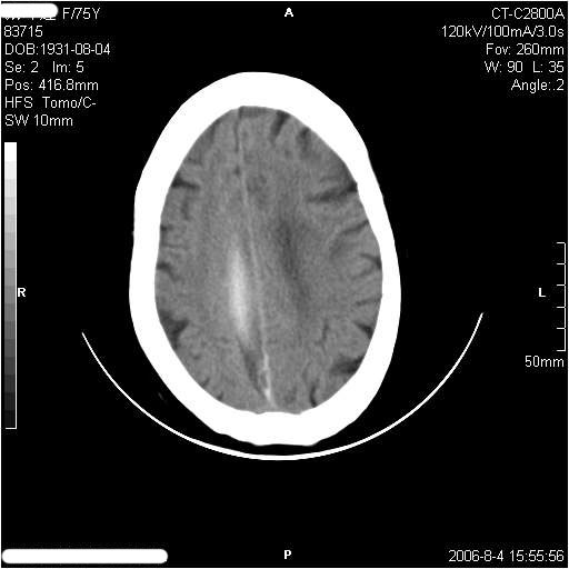2、上纵裂右侧梭形条状高密度影阴,边缘模糊,周围水肿带环绕,右侧脑室受压变形,有摔倒外伤史,多考虑:纵裂硬膜下血肿。