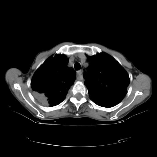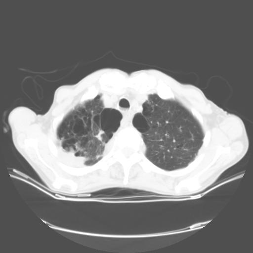 右肺周围型肺癌并脑转移,肺气肿.肺大泡。