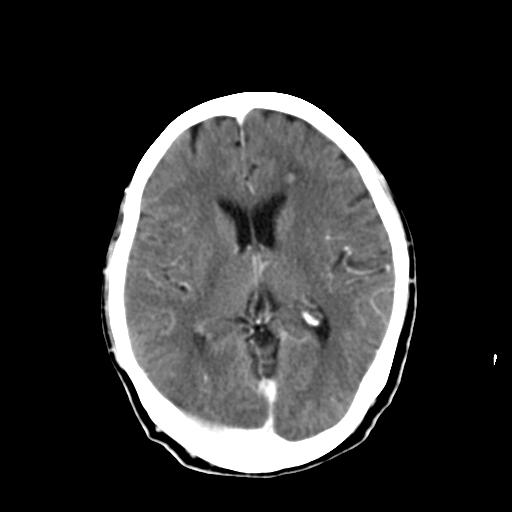 第二个头颅图像不是增强吧!怎么不考虑脑出血呢?右肺占位病变广基底与胸膜相连我觉得胸膜间皮瘤可能性较大。所以我认为是两个独立的病灶!我考虑右侧胸膜间皮瘤,两上肺大泡,顶叶出血。