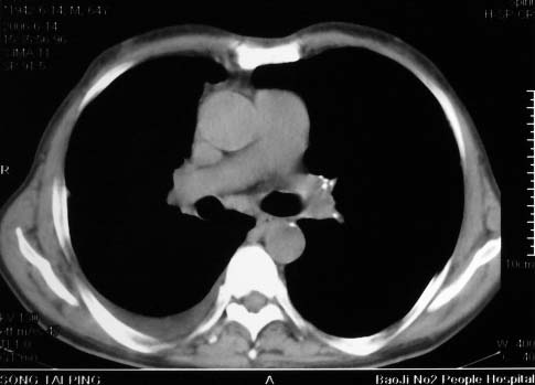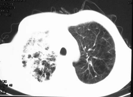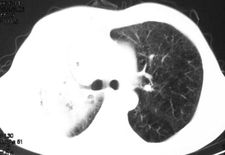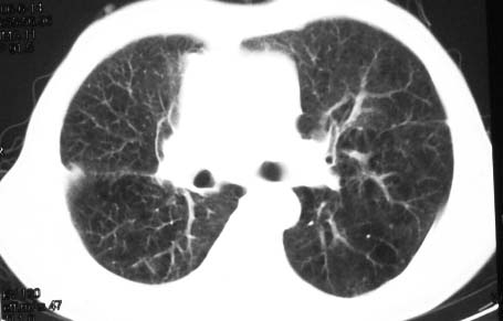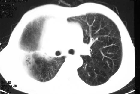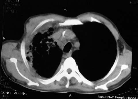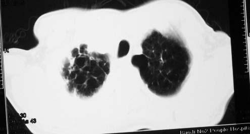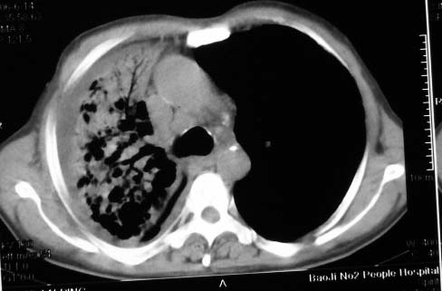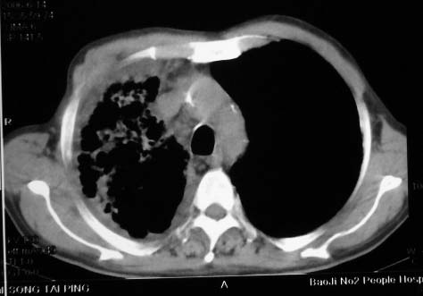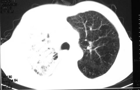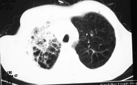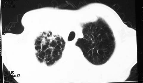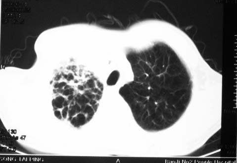 影象表现:右肺上叶大片状、网格状及索条致密影,蜂窝影,其内参杂斑点状小结节,密度不均匀,内见含气支气管像,纵隔内见肿大淋巴结.