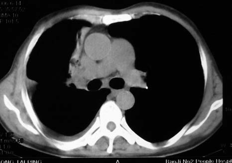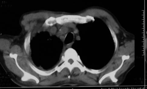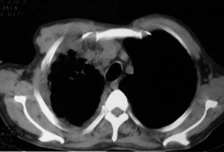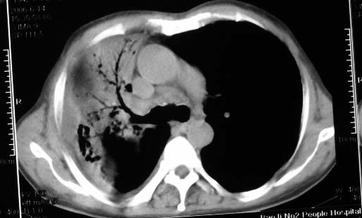 右肺上叶见大片状及索条致密影,密度不均,内见含气支气管症,纵隔内见肿大淋巴结.