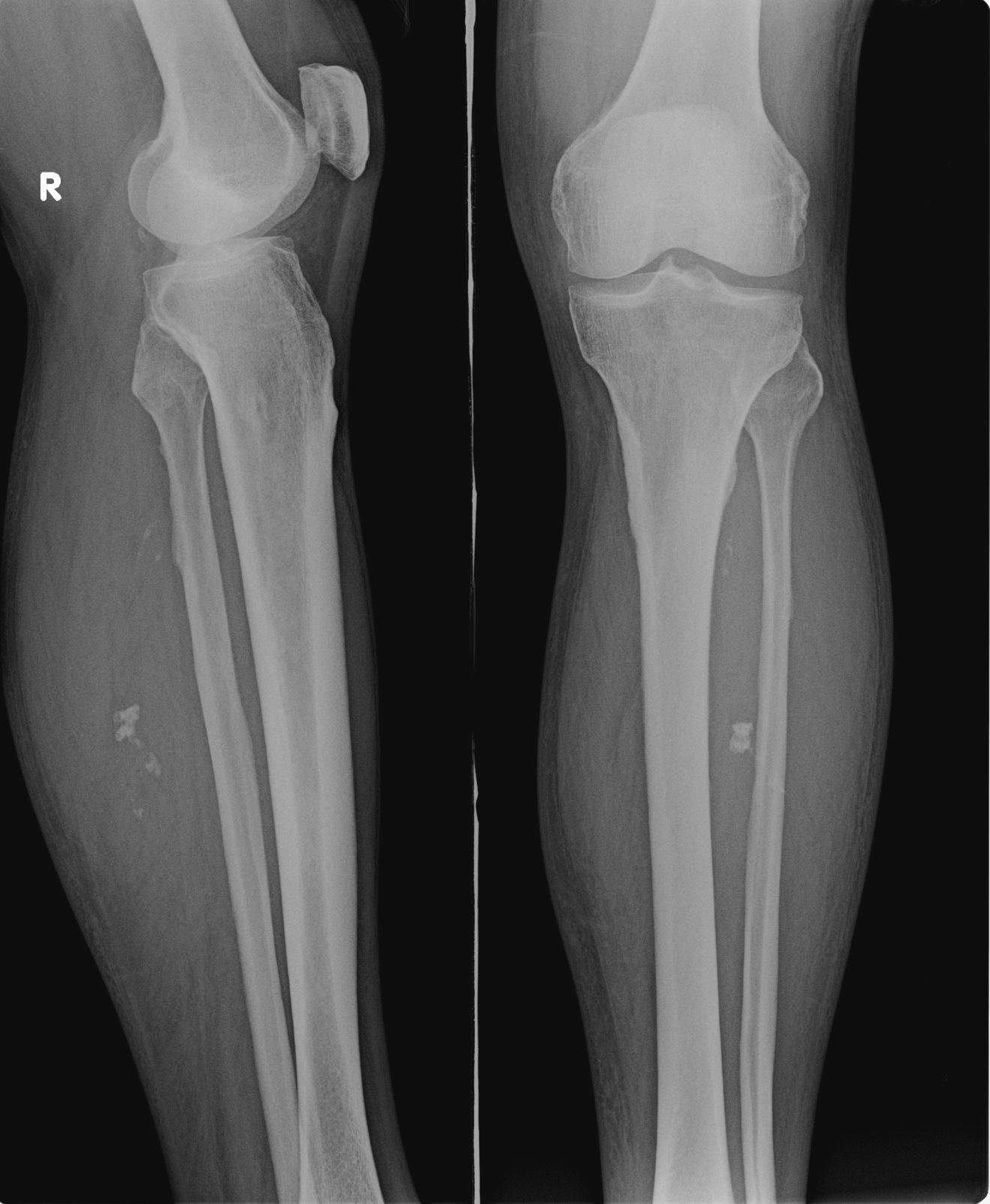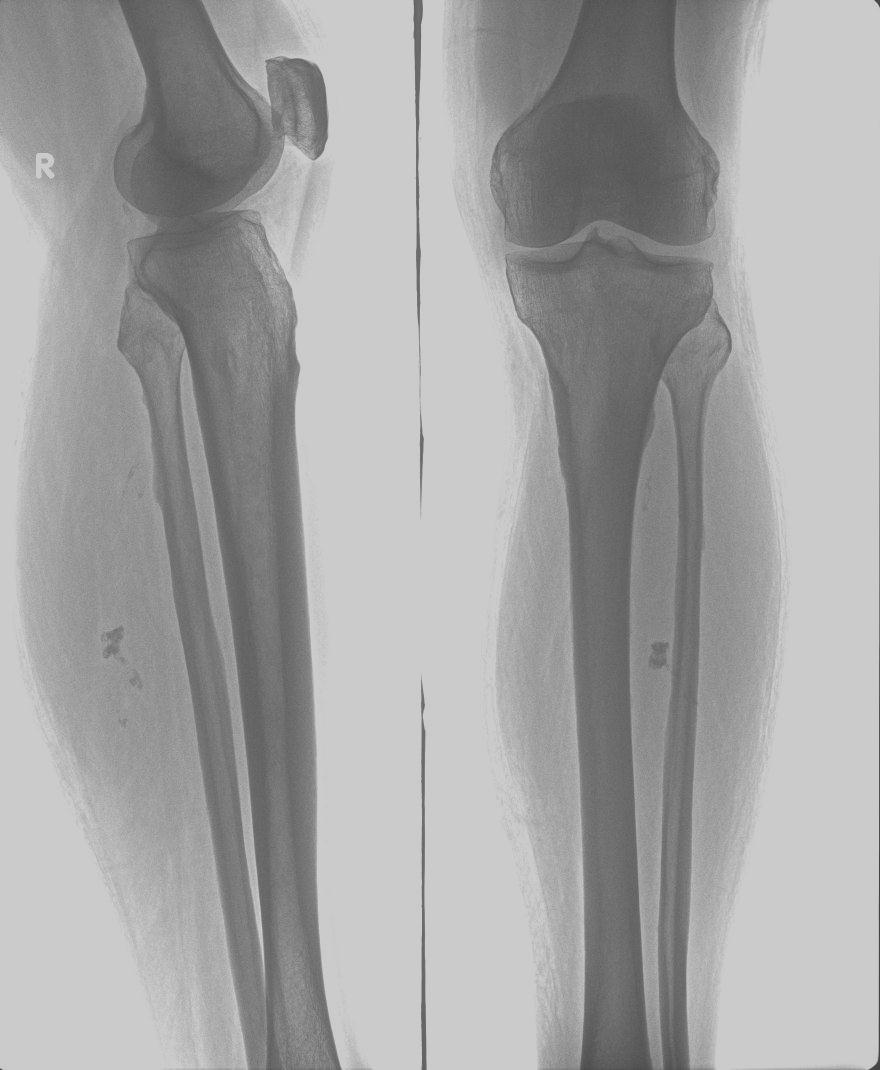 考虑小腿软组织血管瘤或avm伴胫腓骨中上段局限性骨皮质增生,右膝关节退变。
